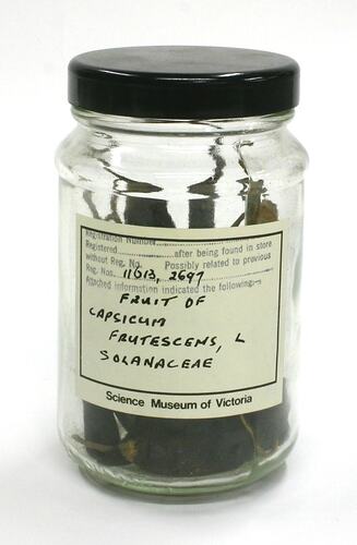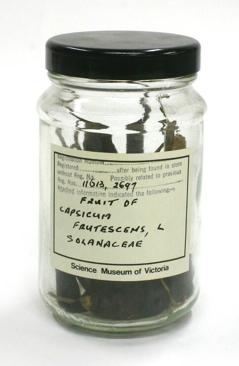 Sample of Capsicum frutescens (Solanaceae) fruit. This was collected and prepared by T.N.Mukharji as part of his work for the Indian Botanical Gardens. It was donated to the Museum by the Indian Government, Culcutta in 1887.