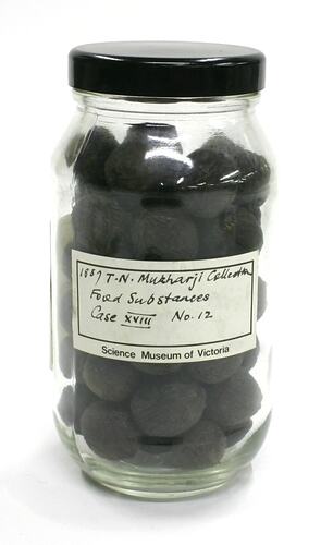 Printed 'Science Museum of Victoria' label with handwritten text affixed to front reads: '1887 T.N. Mukharji Collection / Food Substances / Case XVIII No. 12' Printed 'Science Museum of Victoria' label with handwritten text affixed to reverse reads: 'Zizyphus xylopyra / Fruits / RHAMNACEAE'