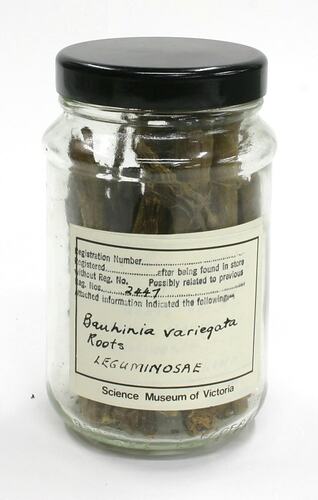 Printed 'Science Museum of Victoria' label with handwritten text affixed to jar reads: 'Bauhinia variegata / Roots / LEGUMINOSAE'