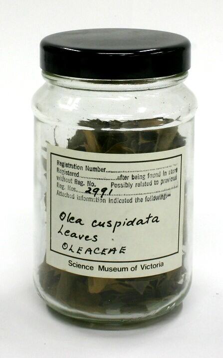 Printed 'Science Museum of Victoria' label with handwritten text affixed to jar reads: 'Olea cuspidata / Leaves / OLEACEAE'