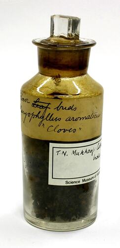 Label affixed to front reads: 'Flower buds / Caryophyllus aromaticus / 'Cloves' Printed 'Science Museum of Victoria' label with handwritten text affixed to jar reads: 'T.N. Mukharji Collection. / India.'