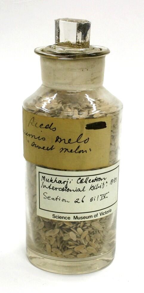Label affixed to front reads: 'Seeds / Cucumis Melo / var. 'Sweet Melon' Printed 'Science Museum of Victoria' label with handwritten text affixed to jar reads: 'Mukharji Collection / International Exhib. 1888 / Section 26 Oil IV'