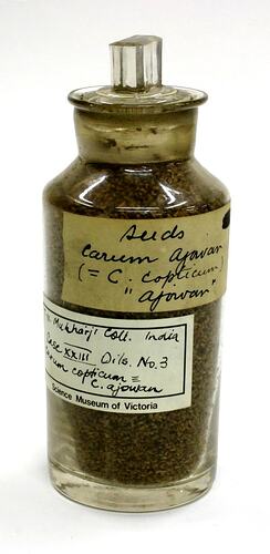 Label with handwritten text affixed to front reads: 'Seeds / Carum Ajavar / (=C. Copticum) 'Ajowan' Printed 'Science Museum of Victoria' label affixed to jar bears handwritten text that reads: 'T.N. Mukharji Coll. India / Case XXIII Oils. No. 3 / C. ajowan'