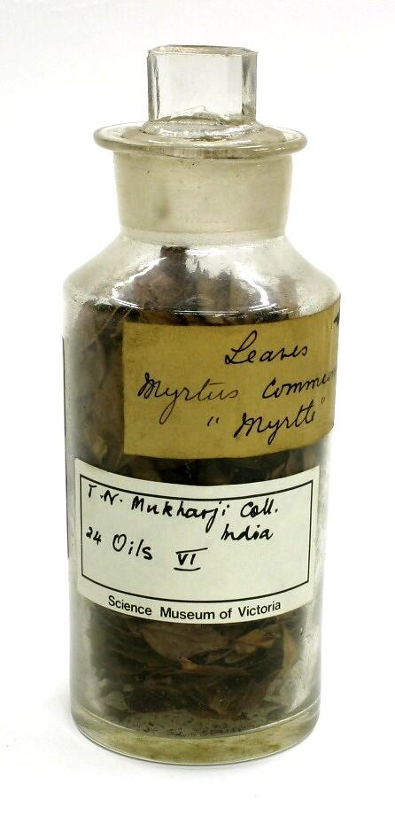 Label with handwritten text affixed to front reads: 'Leaves / Myrtus Communis / 'Myrtle' Printed 'Science Museum of Victoria' label affixed to jar bears handwritten text that reads: 'T.N. Mukharji Coll. / India / 24 Oils VI'