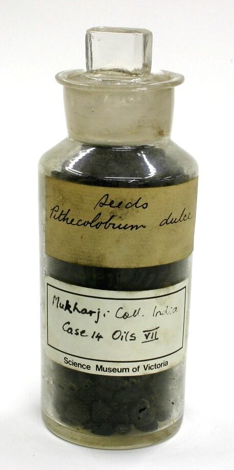 Label affixed to front reads: 'Seeds / Pithecolobium dulce' Printed 'Science Museum of Victoria' label affixed to jar bears handwritten text that reads: 'Mukharji Coll. India. / Case 14 Oils VII'