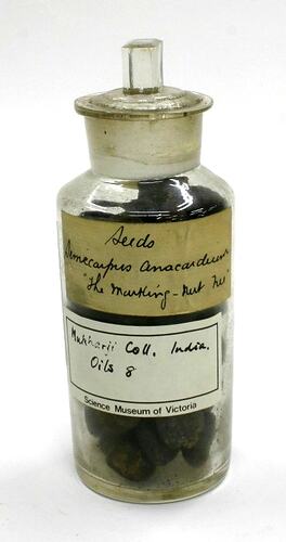 Handwritten label affixed to front reads: 'Seeds / Semecarpus Anacardium / 'The Murtling-Nut [sic] Tree' Printed 'Science Museum of Victoria' label affixed to jar bears handwritten text that reads: 'Mukharji Coll. India. / Oils 8'