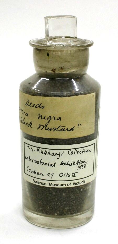 Label, handwritten: "Seeds / Brassica nigra / "Black Mustard"" Science Museum of Victoria label: "T.N. Mukharji Collection / Intercolonial Exhibition 1888 / Section 27 Oils II / Science Museum of Victoria" Further text on labels.