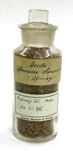 Sample of Spinacea oleracea (Spinach) seeds. This was collected and prepared by T.N.Mukharji as part of his work for the Indian Botanical Gardens. It was donated to the Museum by the Indian Government, Calcutta in 1887. Used for medicinal purposes. Believed to be exhibited at the 1888 Intercolonial Exhibition.