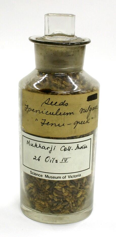 Label, handwritten: "Seeds / Foeniculum vulgare / "Fennel - Greek"" Science Museum of Victoria label: "Mukharji Coll. India / 26 Oils IV / Science Museum of Victoria" Further text on labels.
