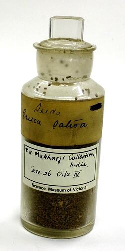 Label, handwritten: "Seeds / Eruca sativa" Science Museum of Victoria label: "T.N. Mukharji Collection / India / Case 26 Oils IV / Science Museum of Victoria" Further text on labels.