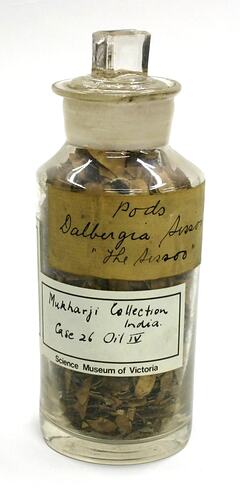 Label, handwritten: "Pods / Dalbergia sissoo / "The Sissoo" Science Museum of Victoria label: "T.N. Mukharji Collection / India / Case 26 Oil IV / Science Museum of Victoria" Further text on labels.