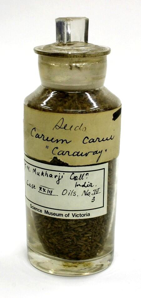 Label, handwritten: "Seeds / Carum Carvi / "Carway" Science Museum of Victoria label: "T.N. Mukharji Colln. / India / Case XXIII Oils. No. III / 3 / Science Museum of Victoria" Further text on labels.