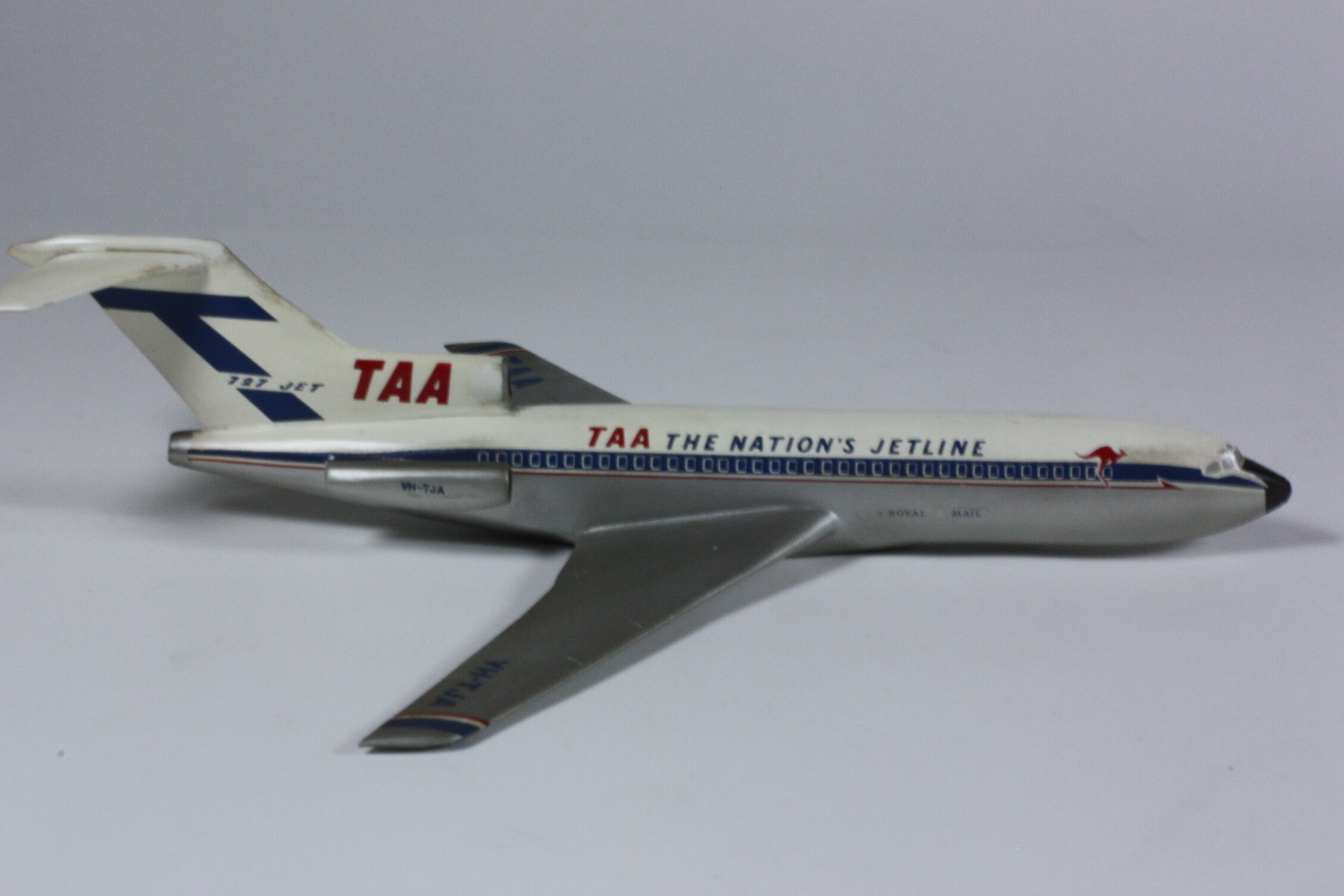 On body of areoplane: TAA THE NATIONS' JETLINE / ROYAL MAIL On tail of aeroplane: TAA / 727 JET On rear engine of areoplane: VH-TJA Across both wings: TAA / VH-TJA On underside of model, handwritten: 578