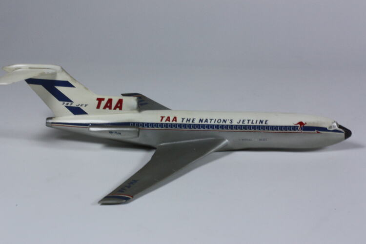 This wooden model is painted to represent Boeing 727-76, VH-TJA operated by Trans Australia Airlines in the mid-1960s. This aircraft was first flown on 24 August 1964 and arrived in Melbourne on 16 October 1964. It was registered VH-TJA with the name 'James Cook' and flew its first passenger service with TAA on 2 November 1964. On 29 January 1971 this aircraft was involved in one of the most serious incidents in Australian aviation history when it struck a DC-8 aircraft which had not cleared the runway at Sydney Airport. VH-TJA was extensively damaged but managed to take off and made an emergency landing without hydraulics forty minutes later. It was repaired and remained with TAA until February 1976. It returned to the USA and was later used by Continental Airlines as N18480 from 1977 to 1991. The aircraft was scrapped in 1993. It is believed that this is a promotional or display model used by TAA in the mid-1960s.