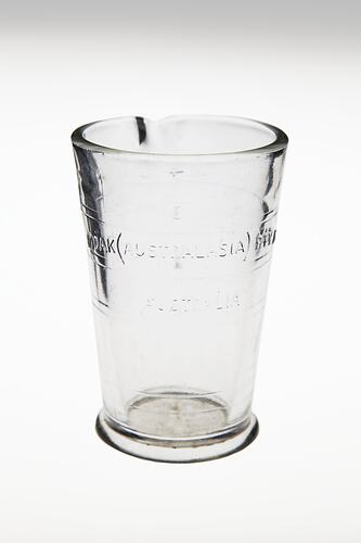 Four ounce glass beaker with pouring spout/lip made by Kodak Australasia Pty. Ltd. for use in photographic laboratory or darkroom. It is unclear if this item was used by research or technical staff at the Kodak Australasia factory in Melbourne or if it was an item for consumers.