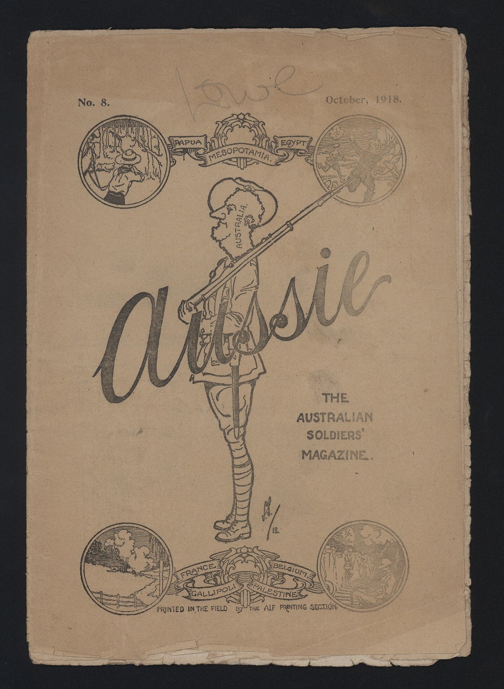 Front cover: "No. 8 October, 1918 / PAPUA / MESOPOTAMIA / EGYPT / Aussie / THE / AUSTRALIAN / SOLDIERS' / MAGAZINE. / FRANCE / BELGIUM / GALLIPOLI / PALESTINE / PRINTED IN THE FIELD BY THE AIF PRINTING SECTION" Text throughout.