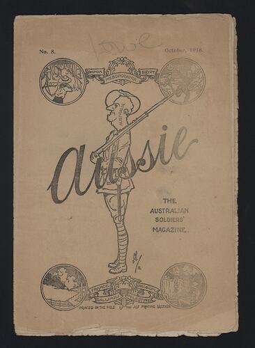 This object provides an Australian soldiers' view of the political and world climate during World War I, and also represents the bond between Australian soldiers. The magazine celebrated a distinctive 'Aussie' identity, through language, humour and their assertion of what it meant to be an Australian. It allowed news to be distributed, gave the soldiers an outlet to express any dissent or dissatisfaction, thus preventing any greater form of rebellion and promoted Australian authors like Banjo Paterson, C.J. Dennis and Bernard O'Dowd. After the war, Phillip Harris produced a monthly in Sydney from 1920 and renamed it: 'Aussie: the Cheerful Monthly'. It built a sizeable circulation and for more than a decade it published the major Australian writers and cartoonists of the day. It set out to sustain the digger culture and defend the rights of the veterans, while also embracing the re-adjustment of returned soldiers into civilian life.