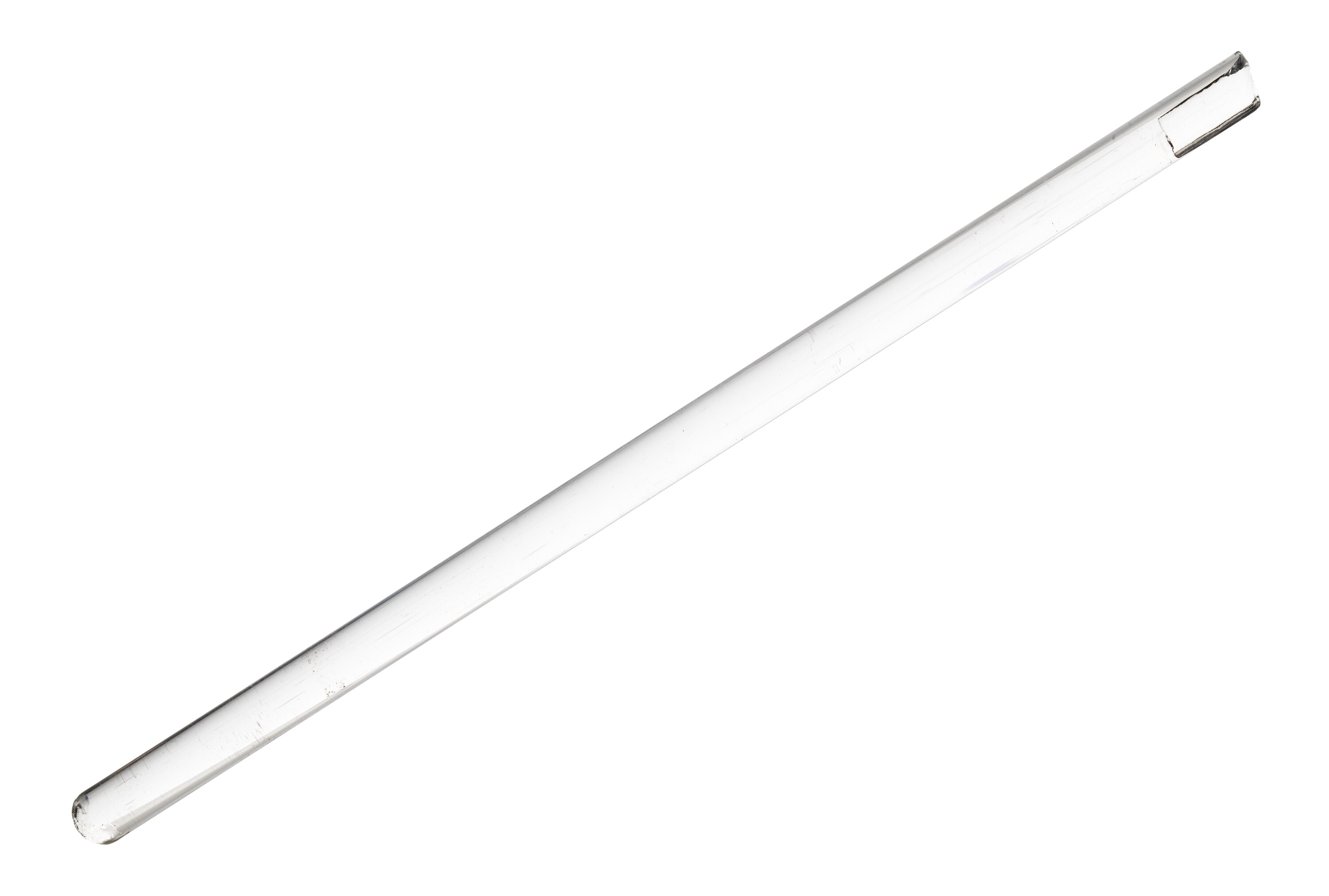 Straight piece of glass, curved at one end with small chips and broken at the other end.