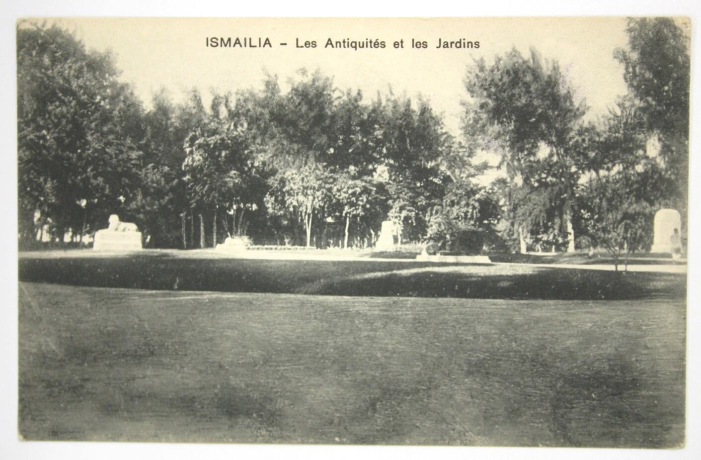 Postcard of ancient monuments in a garden in Ismailia, Egypt. Postcard is titled 'ISMAILIA - Les Antiquities et les Jardins', dating from World War I.