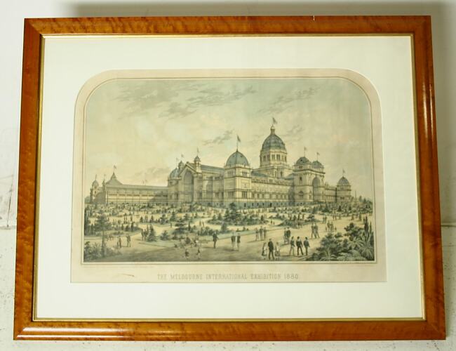 Text, front: THE MELBOURNE INTERNATIONAL EXHIBITION 1880. Printed on label attached to backing board: #33/CONSERVATION FRAMING BY/SANDRA COCKBURN ART SERVICES/13A RAILWAY PLC FAIRFILED VICTORIA 3078/TELEPHONE OR FACSIMILE: (03) 4821726./THE MELBOURNE EXHIBITION/OLD TREASURY BUILDING/ TITLE; THE MELBOURNE INTERNATIONAL EXHIBITION 1880/OWNER: TRUSTEE EXHIBITION BUILDING.
