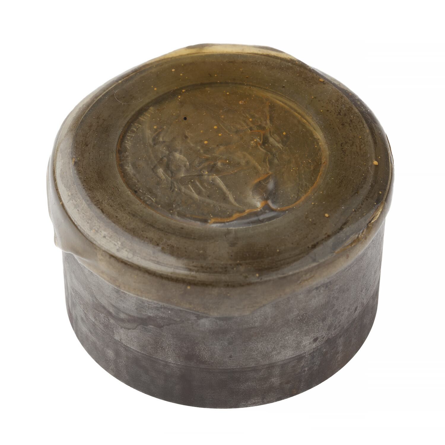 Metal cylinder with intaglio design for obverse of medal. Wax coating.