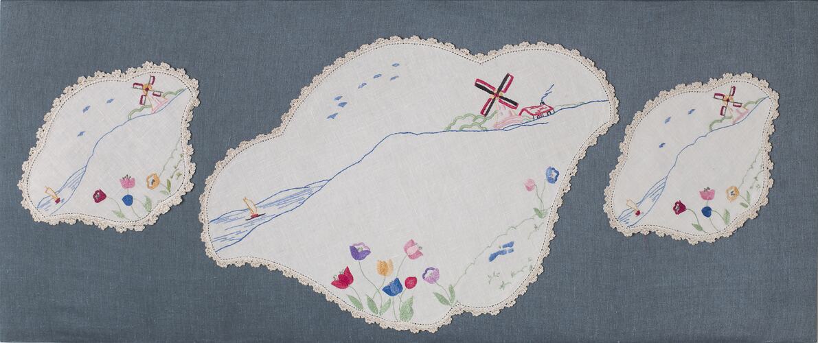 Three piece linen set (one large, two small) with embroidered Dutch motifs (tulips, windmills) in various colours and scalloped, crocheted edging