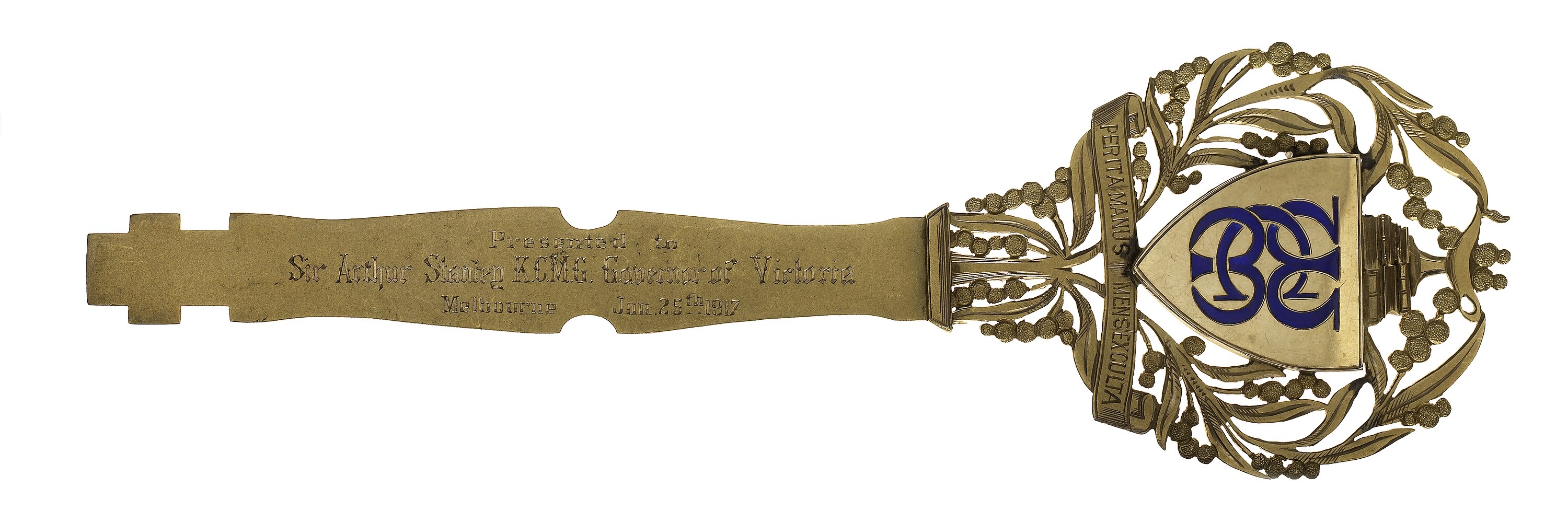 On front of key: W/C/M//PERITA MANUS MENS EXCULTA//Presented to/Sir Arthur Stanley K.C.M.G. Governor of Victoria/Melbourne Jan. 25th 1917. On back of key: School/OF/APPLIED/Art//To commemorate the opening of/The School of Applied Art/Working Men's College