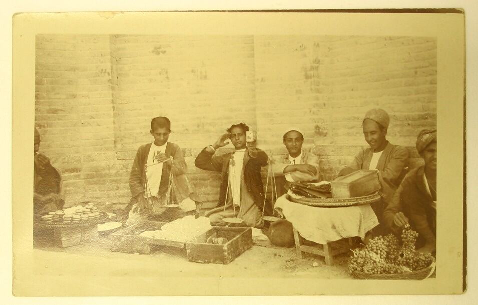 Postcard dating from World War I, showing a black and white photograph of street sellers in the Middle East.