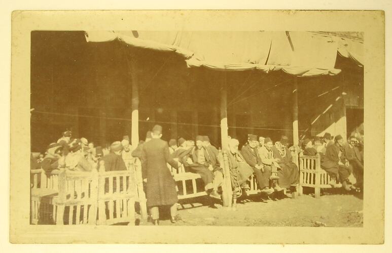 Group of Arab men seated on wooden benches under a verandah.