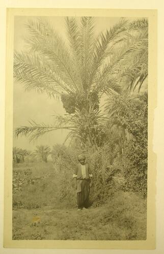 Black and white photograph, dating from World War I, showing an Arab man standing in front of a date palm.