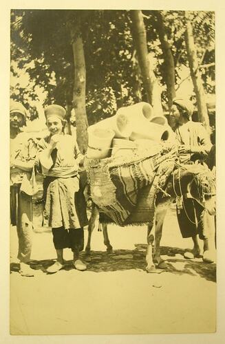 Black and white photograph, dating from the World War I, showing three Arab men standing with a donkey, which has pots tied to its back, in the Middle East.