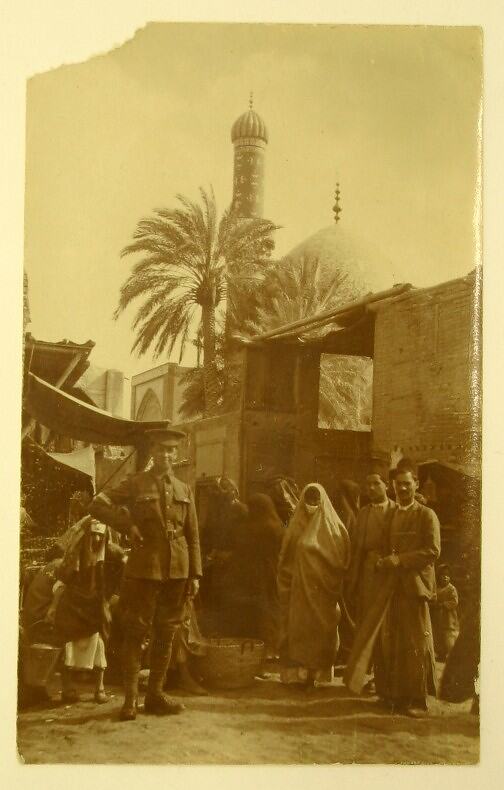 Street scene in the Middle East. A soldier in uniform is standing, posing and facing the camera in the foreground, with Arabic men and women standing around. A minaret can be seen in the background.
