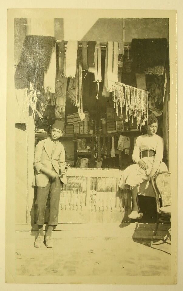 Black and white photograph, dating from the World War I, showing two young men in front of a shop in Baghdad. One is standing, the other sitting on a ledge.