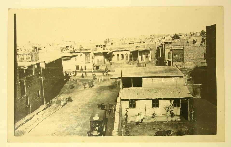 View of a Middle Eastern city, overlooking the roof-tops, with a wide street in the foreground. A motor car, horses and people occupy the street. A minaret can be seen in the background.