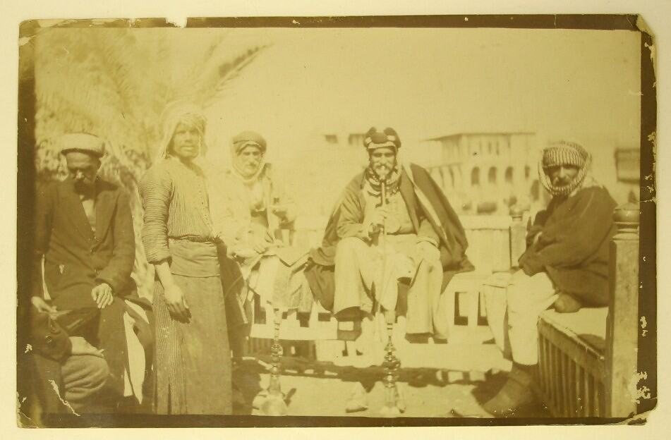 Five men wearing turbans seated along a wall with a palm and arched buildings in the background. Two of the men are standing, three are seated, with two smoking pipes. They are looking at the camera.