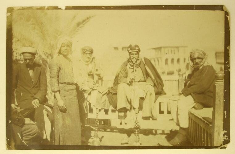 Black and white photograph, dating from World War l, showing five men dressed in traditional clothing, two of them with hukkah pipes.