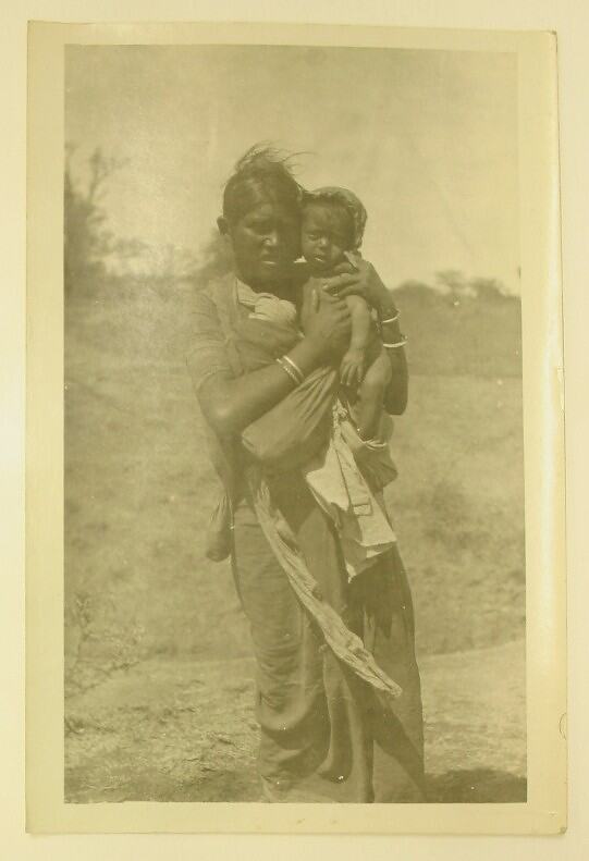 Black and white photograph, dating from World War I, of an Indian woman holding a child.