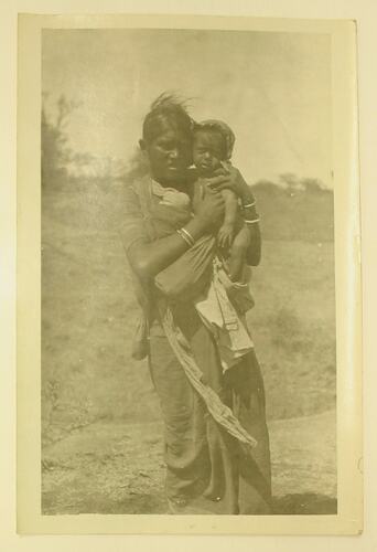 View an indian woman holding a child. The woman is dressed in a sari, and the child is naked, except for a bonnet worn on the childs head.