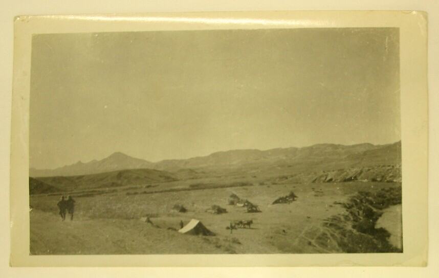 View of a camp site near a river. Image depicts a view from the top of a hill looking over a flat plain, with several tents pitched close to a river bed, on the right hand side of the composition. Hills surround the background of the campsite.