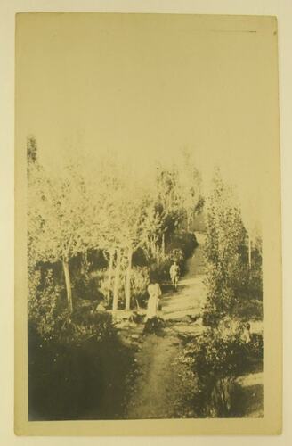 Black and white photograph, dating from World War I, of a woman and a man walking down a garden path.