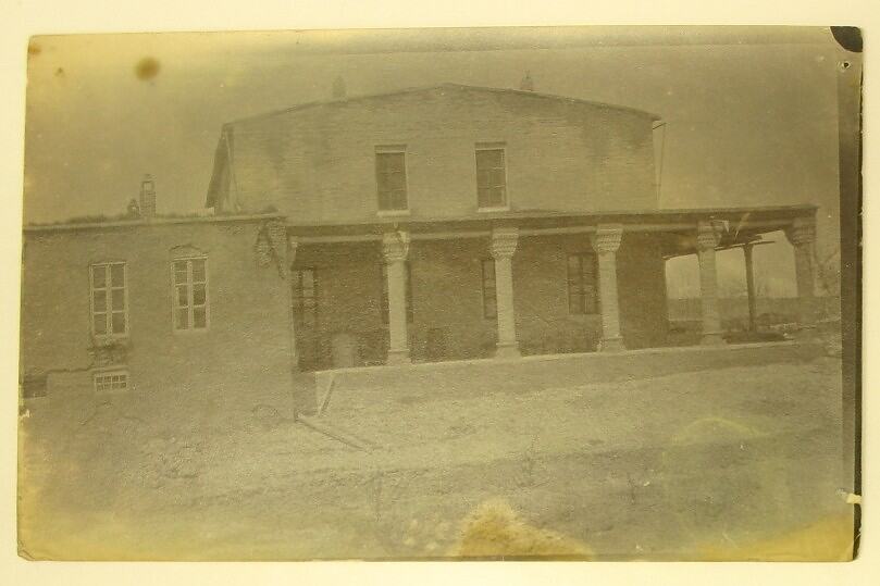 Black and white photograph, dating from World War I, of a building, and surrounding columned verandah.