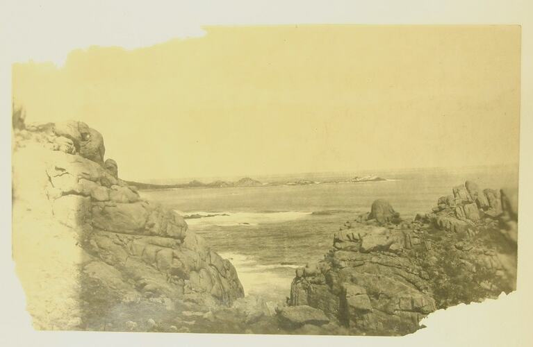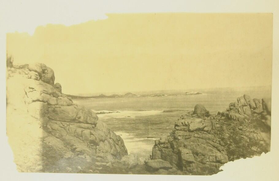Black and white photograph, dating from World War I, showing a view of the ocean from some rocks.