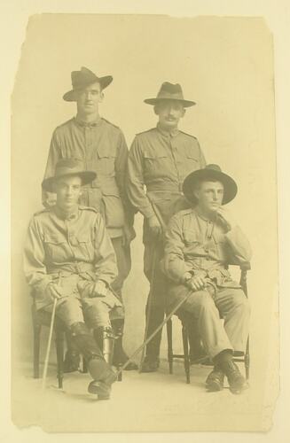 Postcard portrait of men in military uniform. Image depicts four men - two seated at the front, and two standing at the back. All men are wearing hats, and holding crops, and dressed in full military uniform.