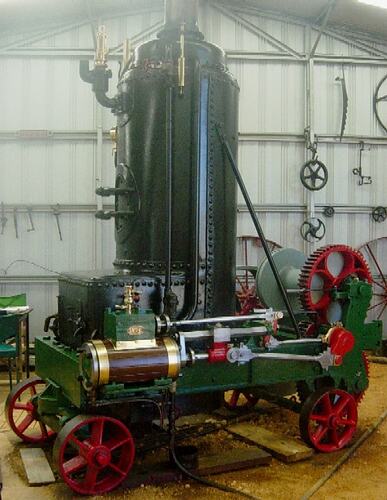 Features a wood and brass lagged double-acting steam cylinder with overhead steam chest and D-slide valve, diamond-section single-bar crosshead guide, driving two horizontally-mounted spur-gear driven contra-rotating winch drums (on second-motion & third-motion). Each winch drum has an independent hand-lever operated dog-clutch and originally had foot-pedal operated band brakes. Boiler consists of an L-shaped vertical tubular boiler, similar to a common locomotive style boiler stood on end, with a rectangular horizontal firebox and vertical barrel which originally contained a bank of multiple fire-tubes feeding the exhaust into a central uptake chimney. The boiler has a rivetted mild-steel shell and was rated at 60 psi (413 kPa) working pressure. The engine, winch mechanism and boiler are mounted on a cast-iron frame with four cast-iron wheels. A long-stroke feed-water pump is mounted on the opposite side of the firebox to the steam cylinder. During restoration the tube-plates and fire-tubes were removed from the inside of the boiler barrel and replaced with self-contained water-tube steam generator comprising a welded dome-ended cylindrical pressure vessel with U-shaped water-tubes in a spiral configuration.