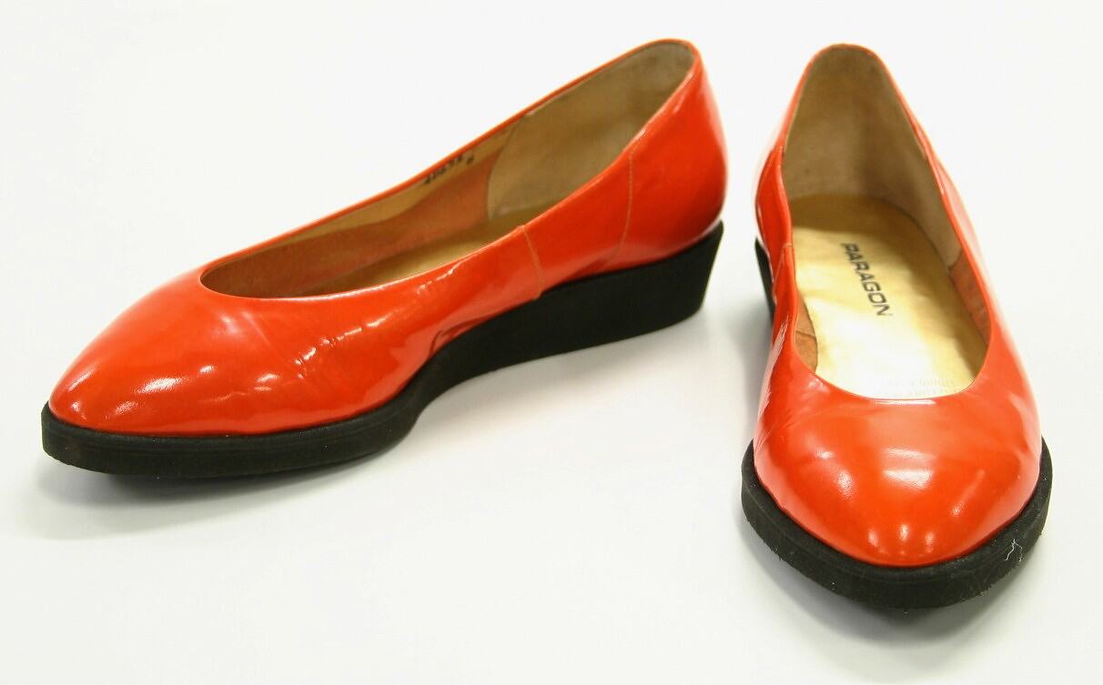 Flat-soled shoes with low wedge sole and low-cut vamp. Uppers of bright orange patent leather. Made by Paragon in the 1980s. Worn by the donor.