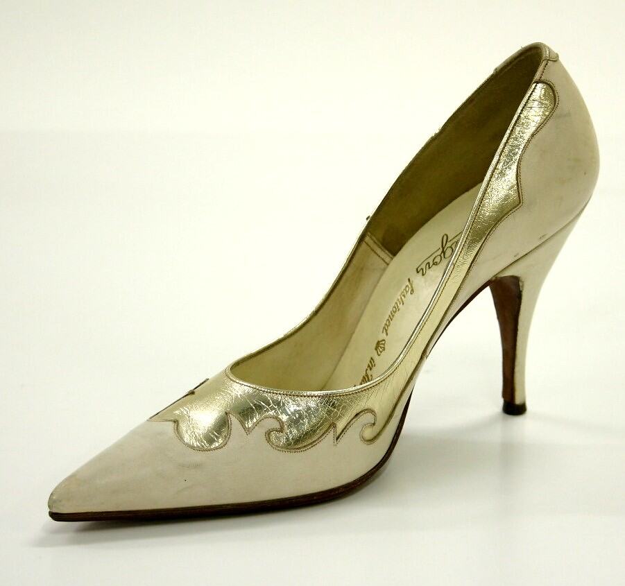 Leather shoe with white and gold 'quad' needle stiletto. Pointed toe and narrow heel. Gold scroll around opening of shoe.