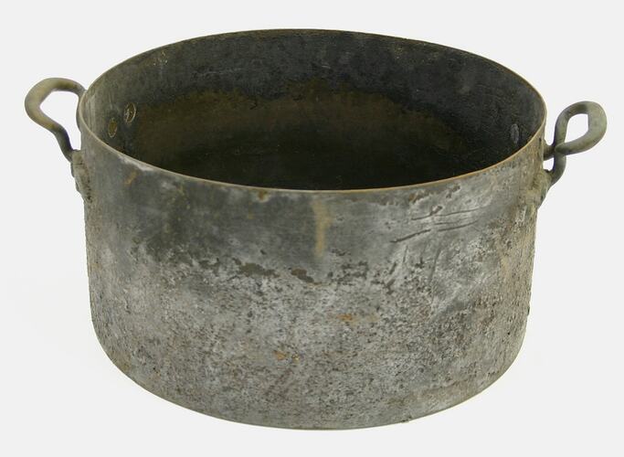 One large copper pot, without lid, used at one time by the catering service at Parliament House. It might have been used in the 19th and/or 20th centuries. It was donated to Museum Victoria by the Public Works Department in 1975.