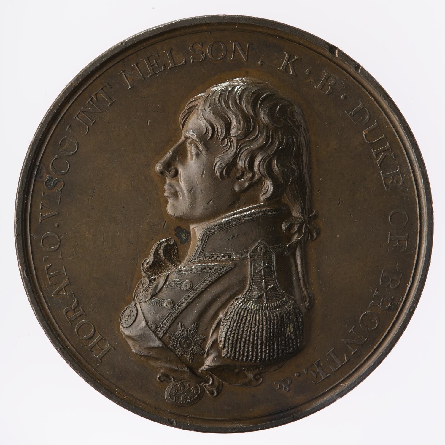 Bust of Lord Nelson facing left in naval uniform; around, HORATIO VISCOUNT NELSON. K· B· DUKE OF BRONTE. &; on truncation C H K (The engraver's initials).
