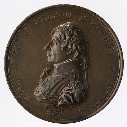 A round copper medal featuring on the obverse a bust of Lord Nelson facing left in naval uniform; around, HORATIO VISCOUNT NELSON. K· B· DUKE OF BRONTE. &; on truncation C H K (The engraver's initials). The reverse depicts a scene from the naval battle; around, ENGLAND EXPECTS EVERY MAN WILL DO HIS DUTY; in exergue: TRAFALGAR OCTR. 21. 1805. The edge is impressed, TO THE HEROES OF TRAFALGAR FROM M: BOULTON.