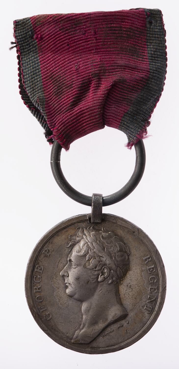 Silver medal bearing on the obverse, a laureate head of the Prince Regent facing left; around, GEORGE P. REGENT below the neck in small letters, T. WYON JUN. S., the artist's name. The reverse features Victory seated on a pedestal with her wings spread holding a palm branch in her right hand and olive branch in her left. The pedestal is set on a block inscribed WATERLOO; around above, WELLINGTON in exergue JUNE 18 1815. The edge is impressed in large roman capitals: SAMUEL BOURNE, 15th. or KING'S REGT. HUSSARS